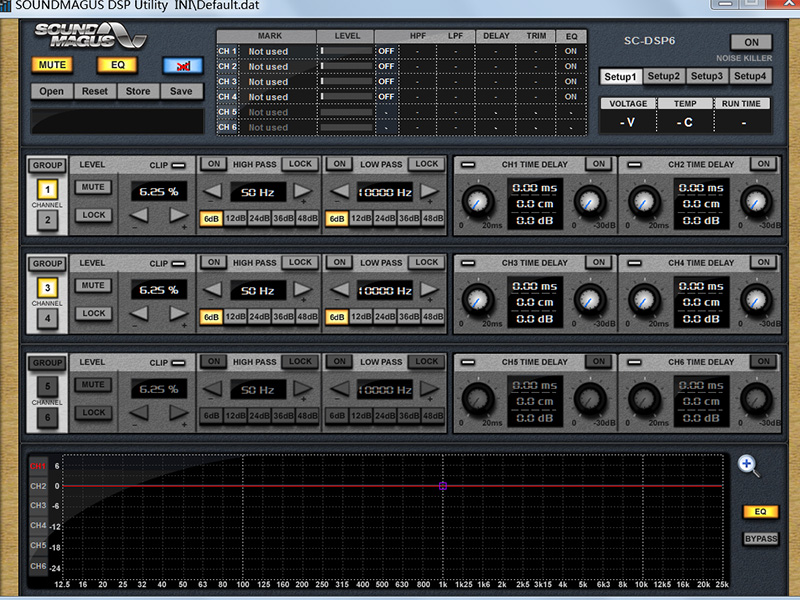 接下來我們和大家介紹SE系列功放以及調(diào)試軟件的具體功能,還有在使用上到底有多么便利。我們手上的這臺SE-150.4,具有四路輸出,使用它就可以組建一個前后聲場、或者2.1系統(tǒng)。而功放專用的調(diào)音軟件功能齊全。軟件支持6聲道輸出,而同時,還有電平、高低通頻率、時間延時和EQ等調(diào)試功能,而這些調(diào)試功能還可以選擇單獨某個聲道調(diào)試、或者雙聲道同步調(diào)試。再具體一點地講,例如在高低通頻率調(diào)試這部分,通過軟件可以對某個聲道或某組雙聲道的高通點和低通點進(jìn)行單獨設(shè)定,又或者可以設(shè)置HPF(高通),LPF(低通),BYPASS(帶通)以及FULL(全通)等輸出模式,而這也就是代表只要通過這個功放和這個軟件,就能夠?qū)冗M(jìn)行主動分頻;而例如在時間延時部分,可以對每個聲道或每組雙聲道,以距離、時間或音量等三種設(shè)定方式,具體調(diào)整其信號延時效果;又例如在EQ部分,軟件自帶了27段的GEQ,同時還帶有4段可以自由選擇頻點、自由設(shè)定Q值的PEQ。