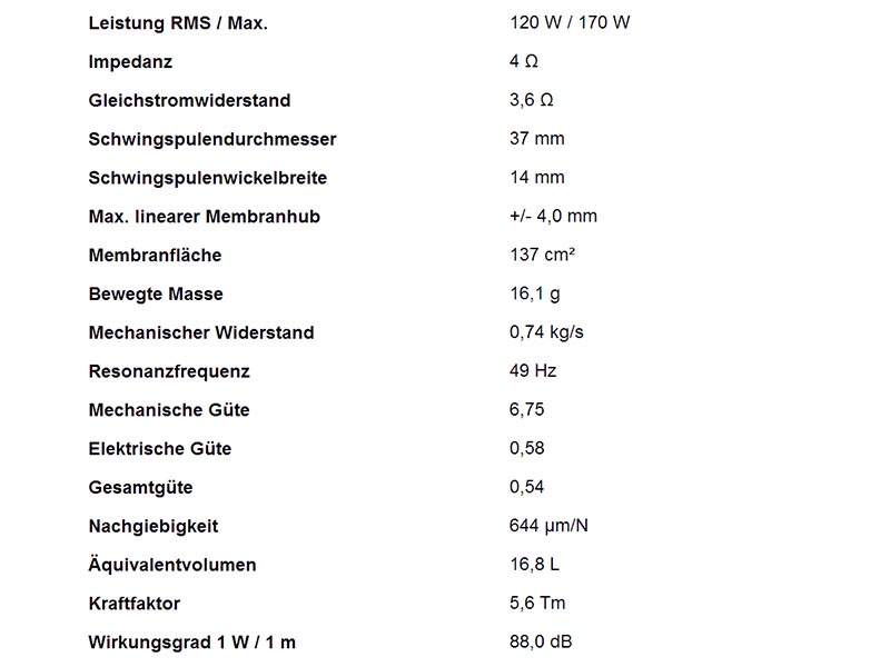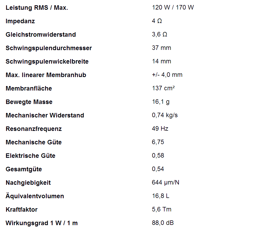 功率:120W/170W,阻抗:4Ω,音圈直徑:37mm,移動(dòng)質(zhì)量:1.61g。這是一款品質(zhì)非常好的中低音喇叭,清晰,有力。