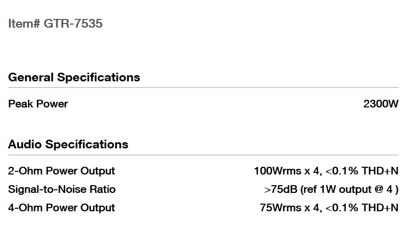 GTR7535 五聲道專業(yè)級(jí)功放,4路實(shí)際功率輸出4X75W,低音部份是 350W實(shí)際功率輸出