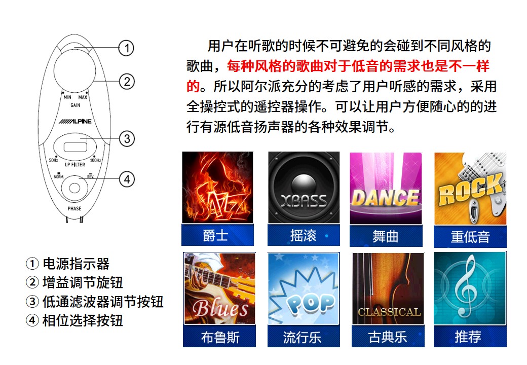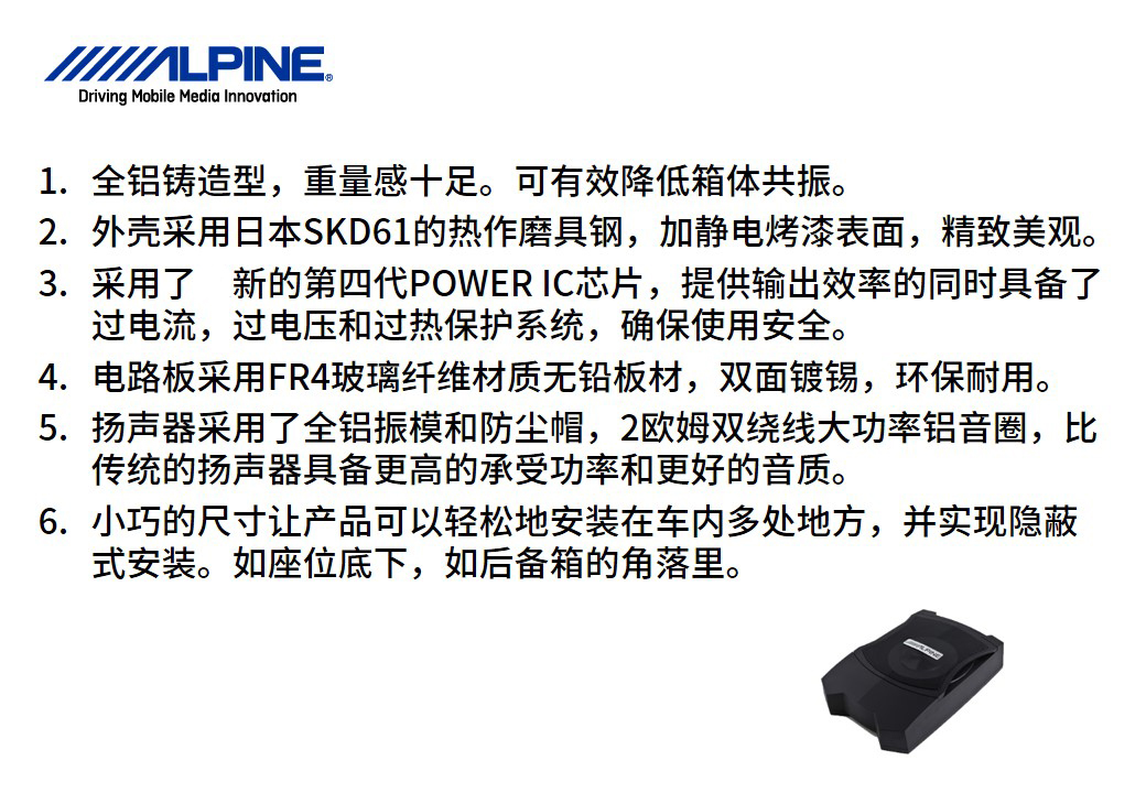阿爾派有源低音炮,采用8寸的低音喇叭,內(nèi)罩大功率的功放,低音強(qiáng)勁,體積小巧,安裝容易