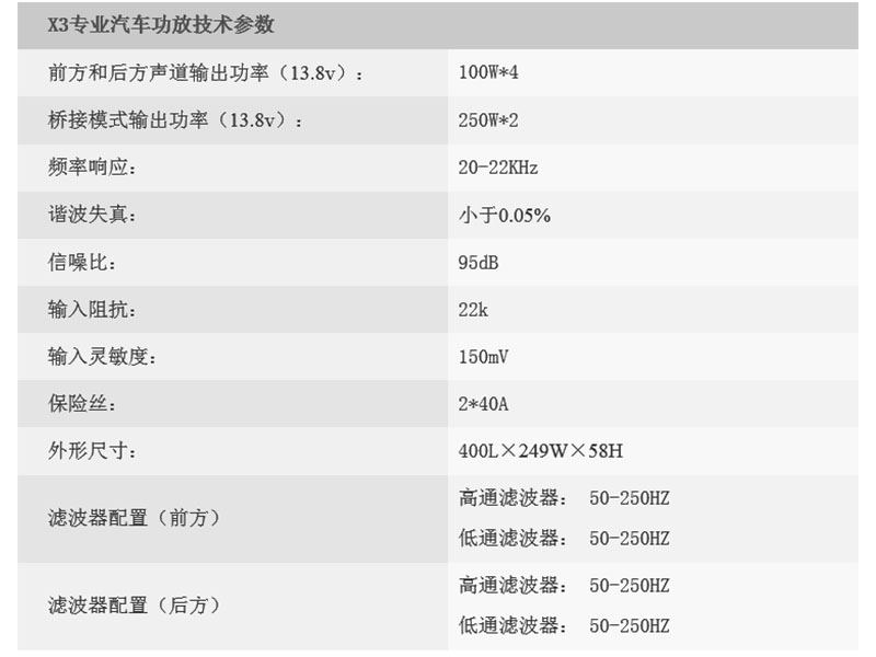 專業(yè)汽車音頻功放變壓器以及音響專用的大容量低內(nèi)阻耐高溫的電容,再配以MOS專業(yè)音頻功率管、高效率開關(guān)電源,為X3提供充沛的電源供應(yīng)和儲(chǔ)備,使連續(xù)的大動(dòng)態(tài)音樂信號(hào)表現(xiàn)得收放自如