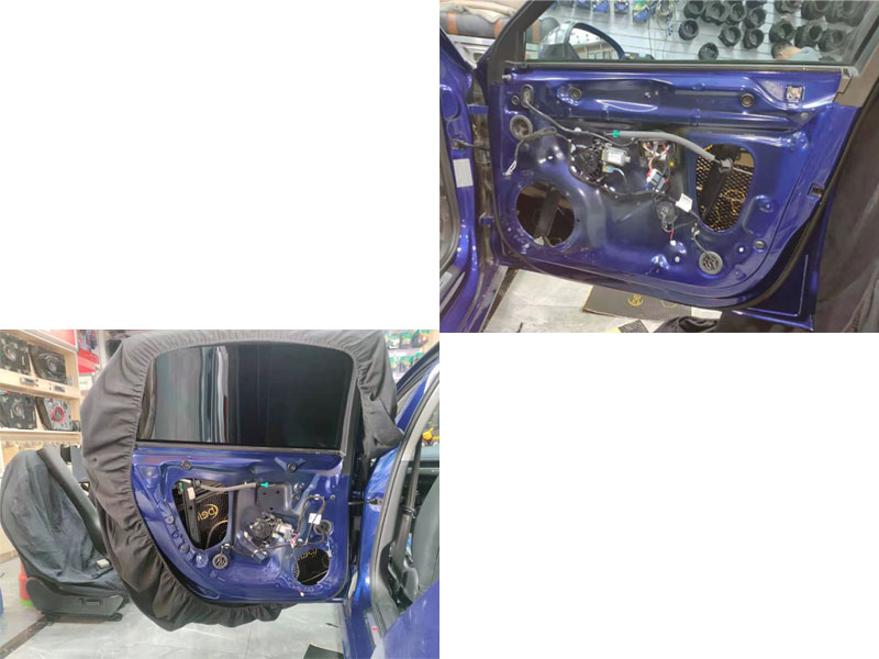 首先是做四門隔音,這里我們用到的是貝爾的隔音黑膜,黑膜要比藍(lán)膜要厚,隔音效果也會(huì)相對(duì)比較好。畢竟這么好的車那不得用好一點(diǎn)的隔音膜嘛!