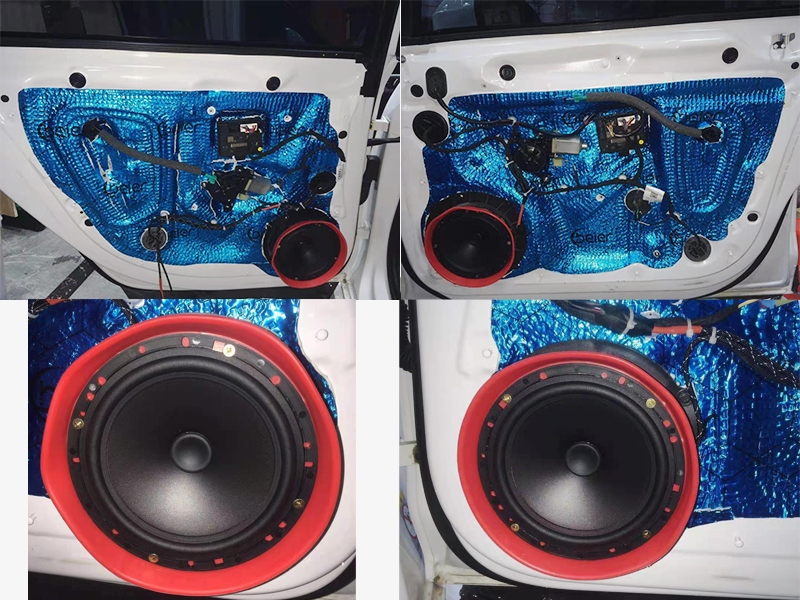 做好第一層隔音之后就是做第二層隔音,步驟其實是和第一層相差無異,然后就是喇叭的安裝,奧迪A4的車門上有四個中低音,我們有專車專用的喇叭墊和防水罩來配合安裝。既保護了您的愛車也能延長喇叭的使用壽命。