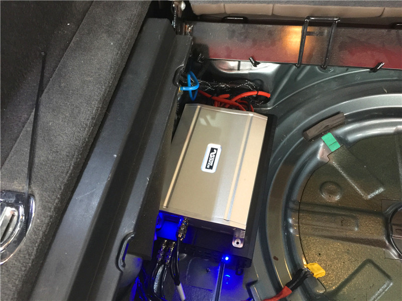 兩臺(tái)功放安裝在備胎側(cè)邊,合理利用有限空間。一臺(tái)推動(dòng)前后門(mén),一臺(tái)推低音。
