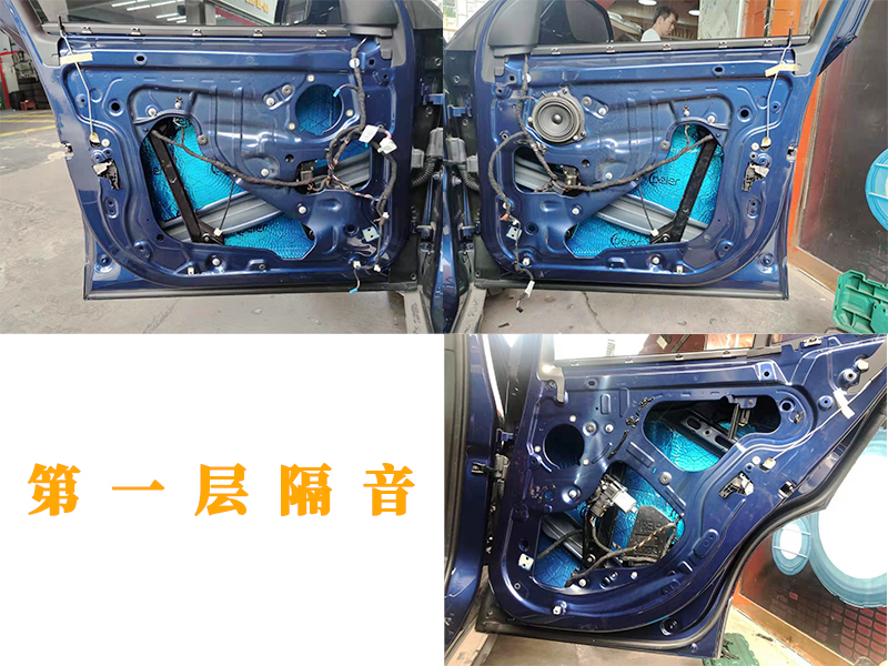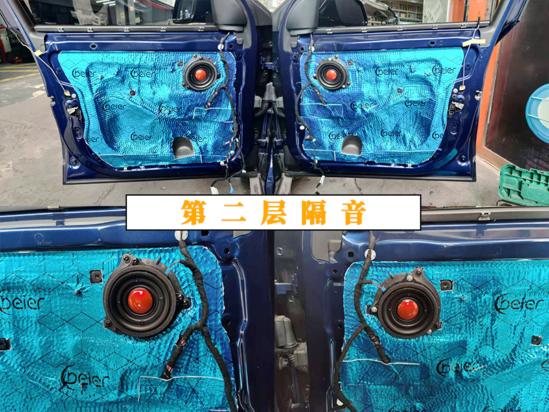 第一層隔音就是在內(nèi)壁,主要就是減震減少異響。使用的材料是貝爾的藍(lán)膜。也是一款選裝最為頻繁的一款隔音減震板。