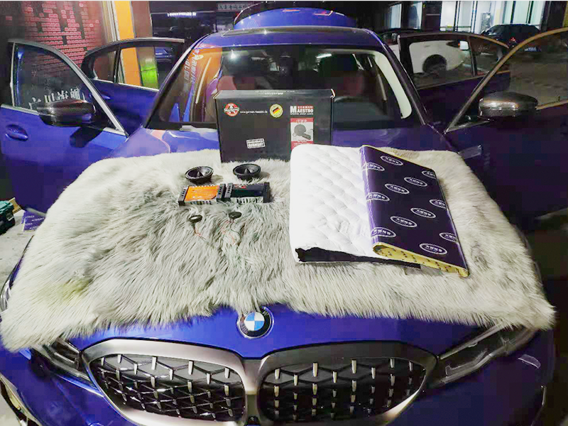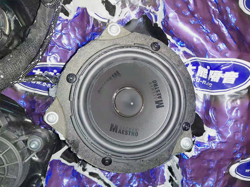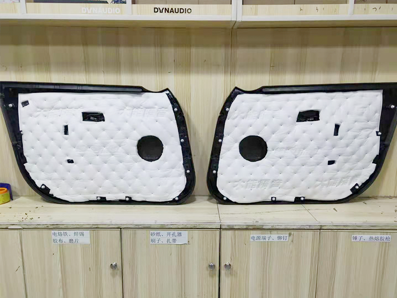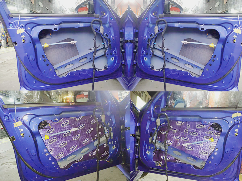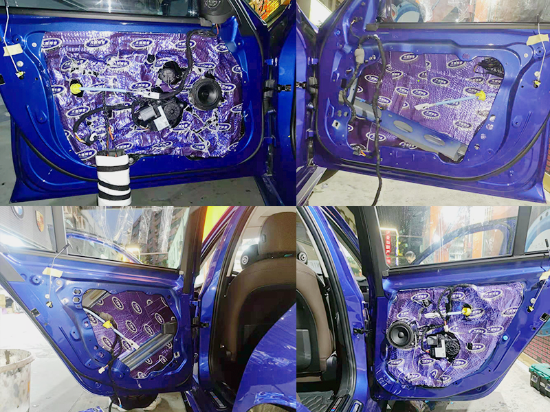 原車單一的鐵皮是音質不夠渾厚的直接原因。為了減少共振和防止聲音的擴散。這里我們使用了大能藍金剛膜隔音和加厚了鐵皮。