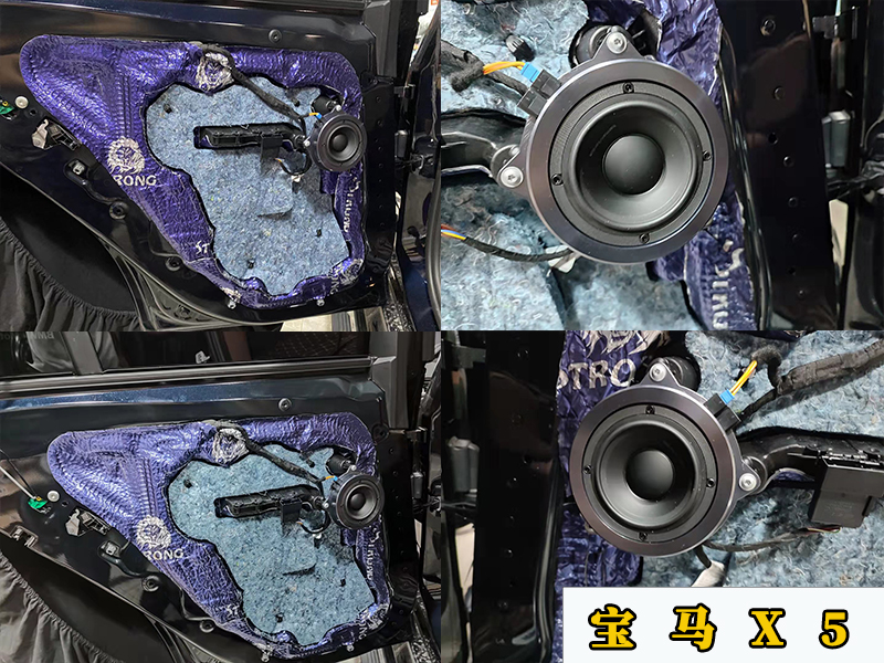 先簡單看一下配置,寶馬X5的門板喇叭是4寸的。而且都是定制的三角外形。這里全車用的都是定制的哈曼卡頓,原車前門是兩分頻加上中置加上座位下的兩個低音喇叭再加上后門的兩個中音。一共是10個喇叭。這一套升級的是16個哈曼卡頓的喇叭,多出來的是4個后環(huán)繞和后門的兩個高音。另外加裝了處理器和一臺4路攻防來推。