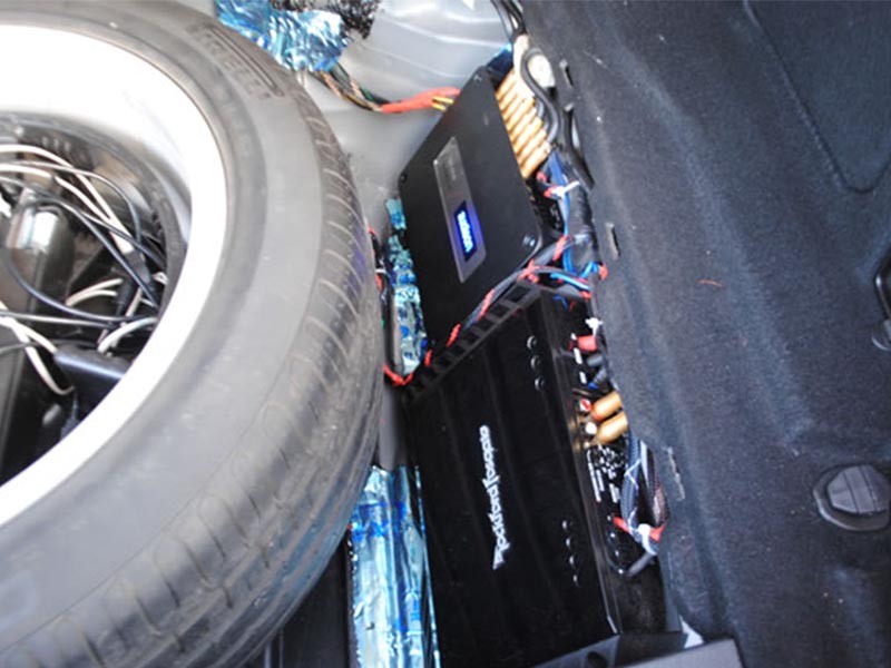 6,歐迪臣的處理器與來(lái)福T500-1BD功放安裝在備胎側(cè)面,空間的利用悄到好處