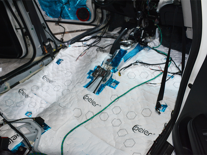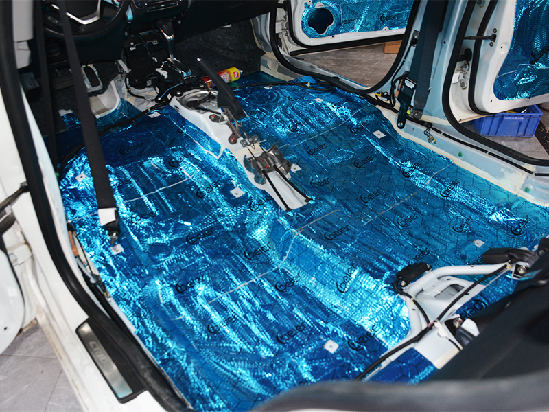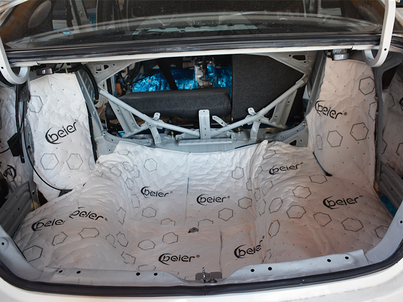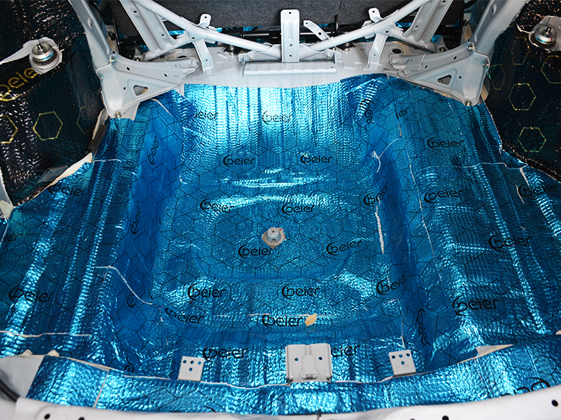 車內(nèi)低盤和尾箱的第一層施工效果圖:使用了廣州德樂的貝爾綠色環(huán)保材料隔音。底盤和尾箱鈑金加強后防止汽車行駛過程中沙石、排汽管和路噪、胎噪所產(chǎn)生的復(fù)雜噪音對車內(nèi)的鈑金傳播渠道,可以降低50%共振共鳴的噪音頻段