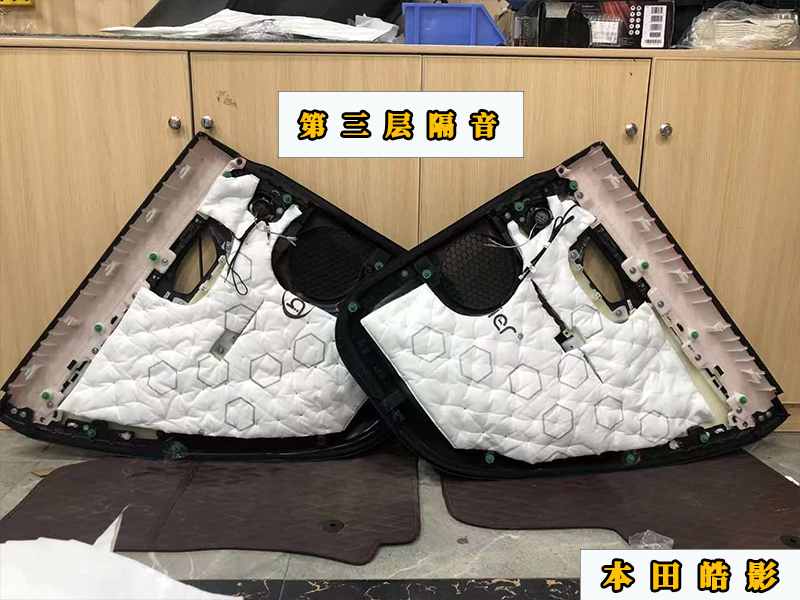 門板隔音是三層的,這里選用的是貝爾的止震板,止震板的好壞第一個(gè)標(biāo)準(zhǔn)是不留膠,所以選對(duì)牌子和專業(yè)的門店很重要,不然留膠了的話,清理起來(lái)就麻煩了。