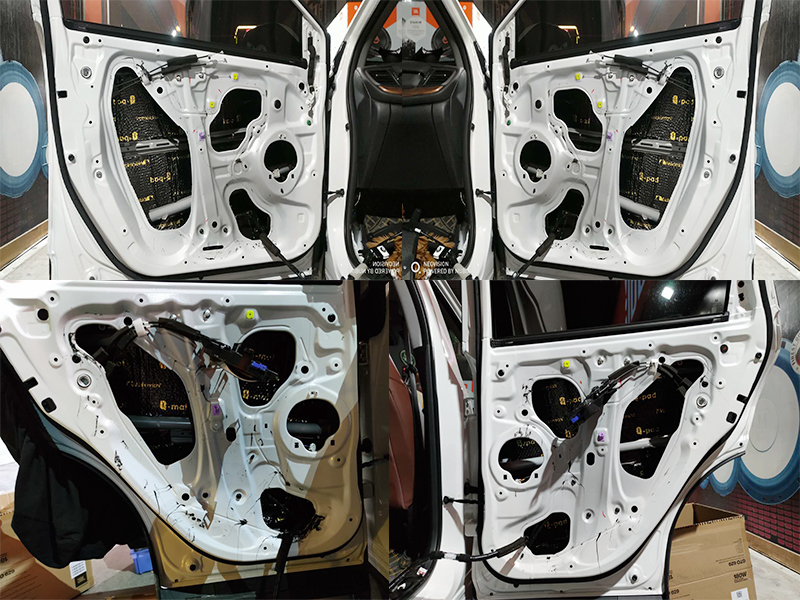 拆卸門板后,第一步就是第一層鈑金加強減少共振點,提升音質效果,加強原車的被碰撞的安裝性能