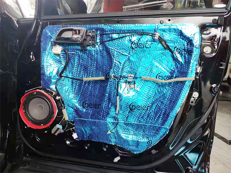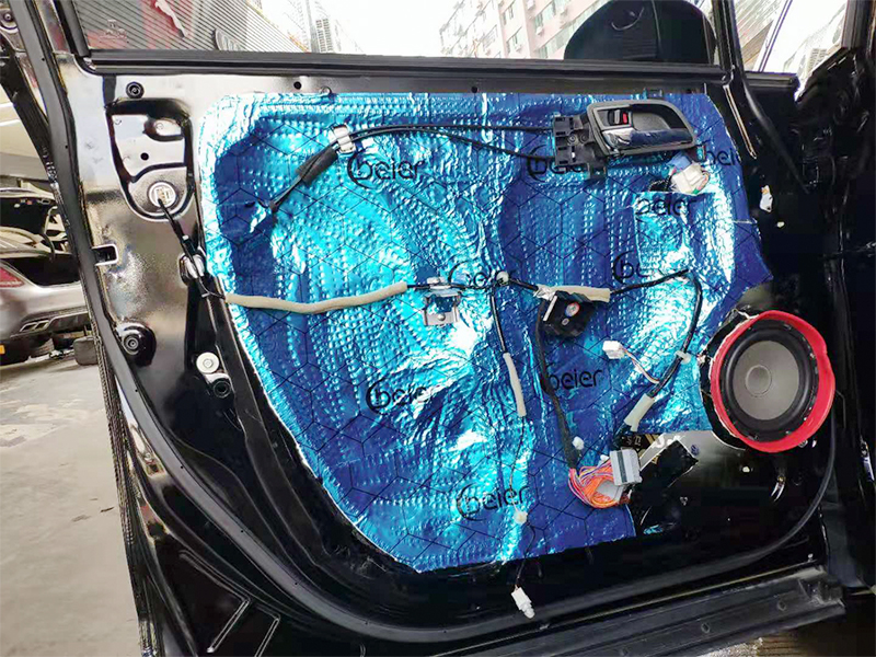 接下來就是隔音使用貝爾藍(lán)膜做門板隔音,加強(qiáng)原車鈑金的密度。大大加強(qiáng)喇叭的音樂效果的同時(shí)對(duì)風(fēng)噪無限的消除