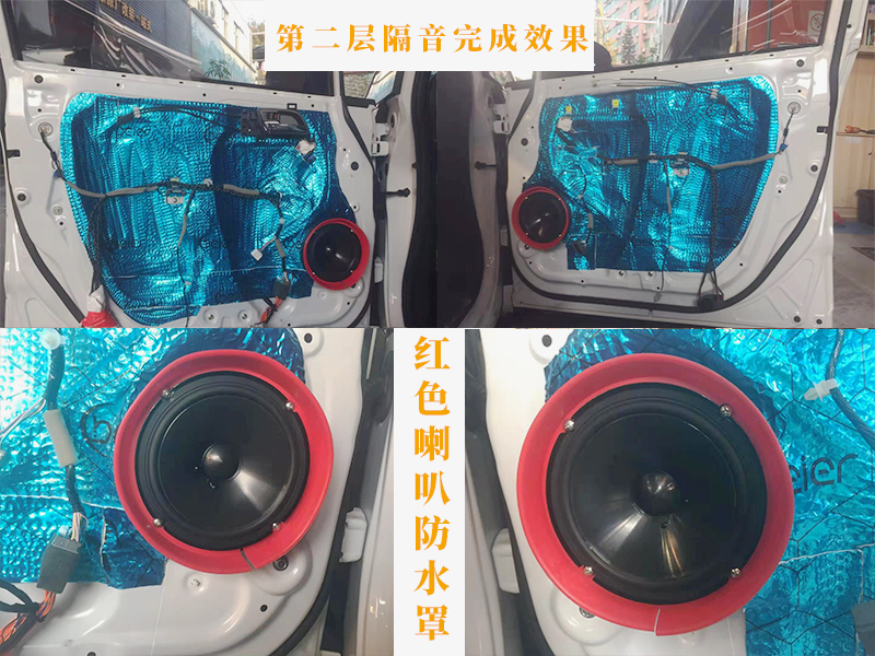 第二層隔音和喇叭的安裝是相對(duì)比較復(fù)雜的過程。其實(shí)原理也就那樣,第二層隔音可以形成箱體。就好像你把手機(jī)放到一個(gè)容器中播放音樂,音質(zhì)也會(huì)發(fā)生改變。這里也是如此,箱體能提供更好的聲音傳播。喇叭上紅色的外圈是防水喇叭罩。能有效保護(hù)喇叭。