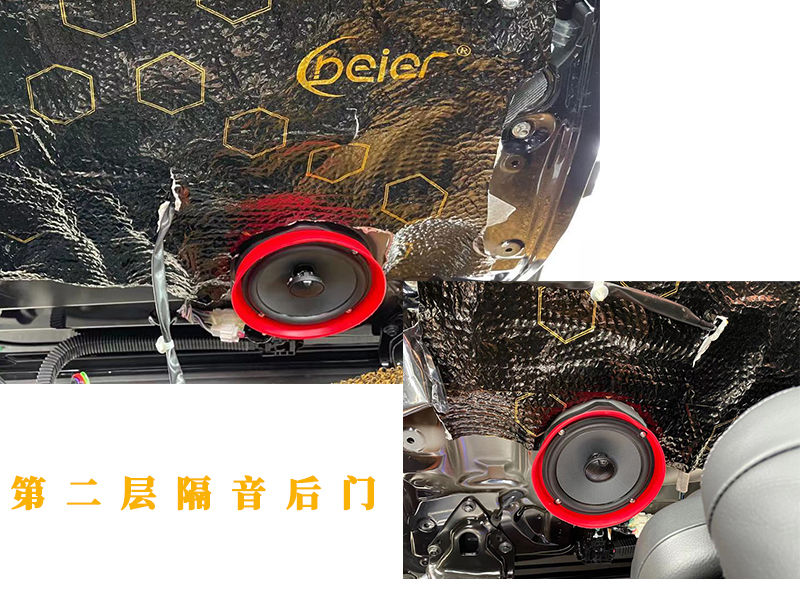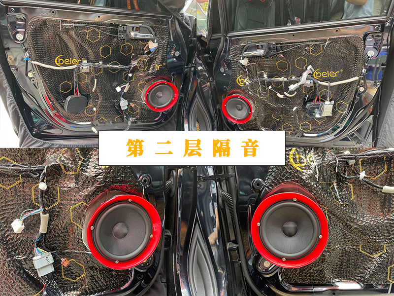 這邊看到的是貼完第二層隔音之后安裝喇叭的效果圖,其實(shí)門(mén)板上面是三層隔音的,就是在門(mén)板的內(nèi)部,靠近外面的那塊門(mén)板上也貼有一層隔音膜,第一層減震減異響,第二層做箱體,雙層隔音下,您的車門(mén)就變成了一個(gè)移動(dòng)的音箱,音質(zhì)好不是問(wèn)題,主要的是,行駛中的風(fēng)噪變小了,享受音樂(lè)的心情也變好了。