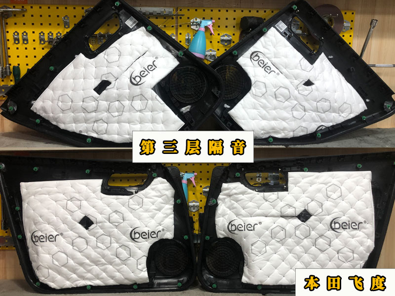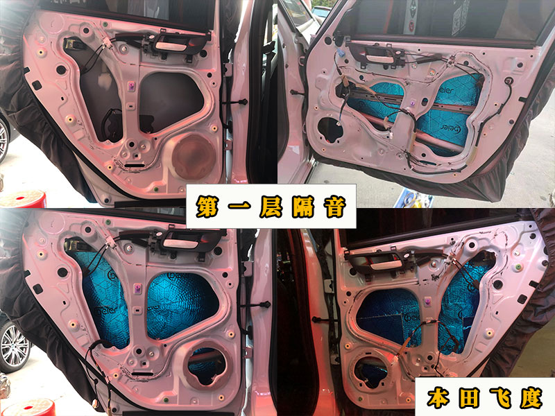 先看一下四門隔音,門板的噪音來源是風(fēng)噪和自身的共振,原車門板的鋁板過薄是罪魁禍?zhǔn)住6谝粚痈粢艟褪窃黾娱T板厚度減少共振。提升了隔音效果和音質(zhì)效果。