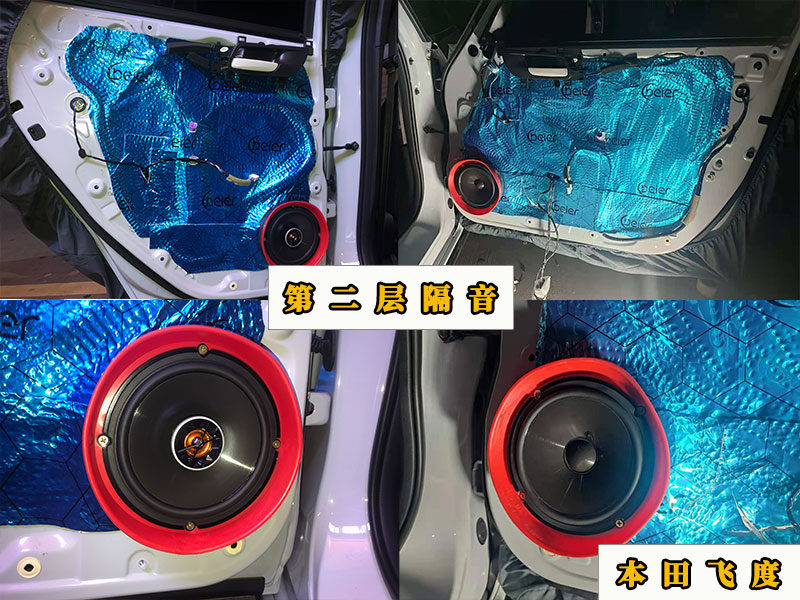 第二層隔音主要是做密封的,畢竟音箱不密封的話是會(huì)露音的。那樣的話音質(zhì)就會(huì)大打折扣了。再看看喇叭的安裝上,前門是套裝的喇叭,后門是同軸喇叭!使用的喇叭墊是專車專用的,就是本田車有本田的喇叭墊,還有就是喇叭外面那層是防水罩來的,字面意思,防水的。