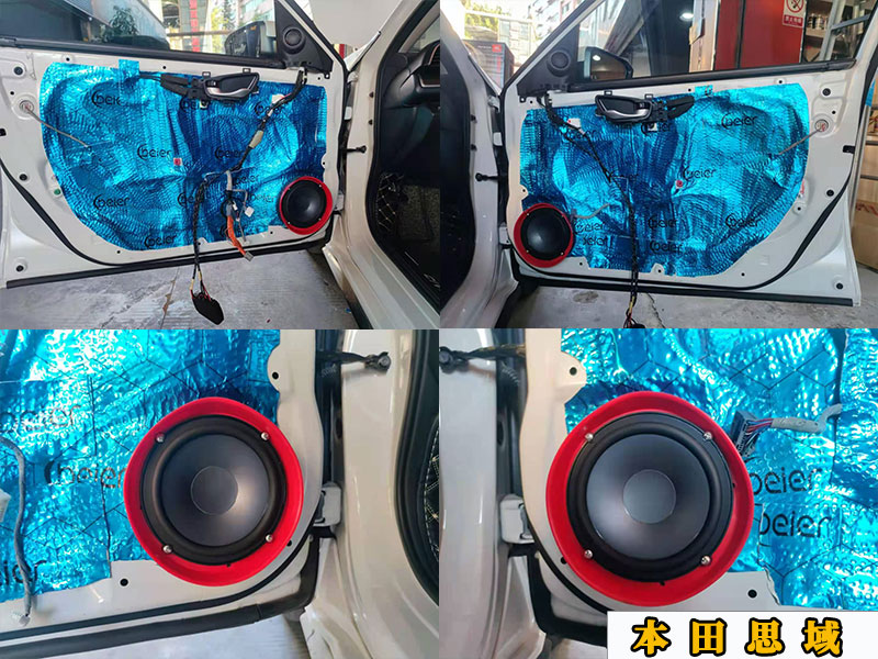 第二層隔音是密封的作用,思域的后門是不配備喇叭的,兩個(gè)中低音轉(zhuǎn)到了后平臺(tái),這次給升級(jí)為JBL的同軸喇叭,當(dāng)然也要貼上一個(gè)隔音來防止共振。喇叭的安裝都是原安裝位和專用的喇叭墊和喇叭防水罩。