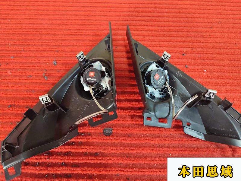 先簡單看一下配置,升級的是四門喇叭和加裝一個處理器,前門升級的是6500的套裝喇叭,包括兩個中低音兩個高音、兩個分頻器。思域的后門是沒有喇叭的,喇叭被轉(zhuǎn)移到了后平臺上。升級的是兩個同軸喇叭!并且還加裝了一臺處理器來進行調(diào)音。隔音用的是貝爾的藍膜。