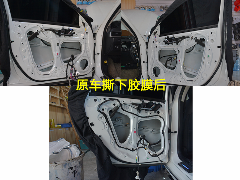 拆開門板,原車前后門板只有單薄的塑料防水層,起不到隔音的作用,而且容易產(chǎn)生異響
