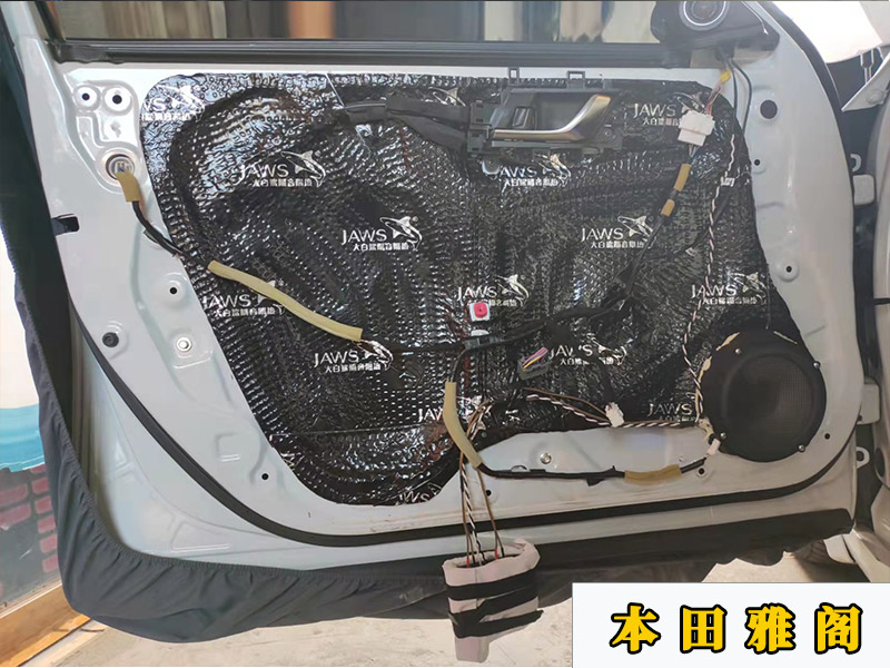 這臺(tái)雅閣原車是只有前門兩個(gè)中低音和后排的兩個(gè)中低音。高音都是沒有的。這邊升級(jí)的是前后都用了套裝喇叭,加了四個(gè)高音,一共是8個(gè)喇叭,座位底下還加了一個(gè)超薄的低音炮,一個(gè)JBL的處理器。門板隔音依舊是三層