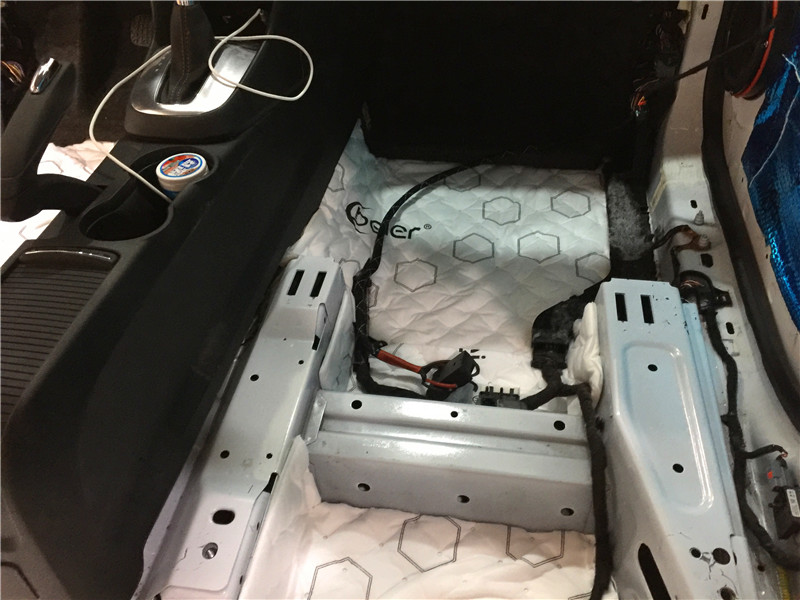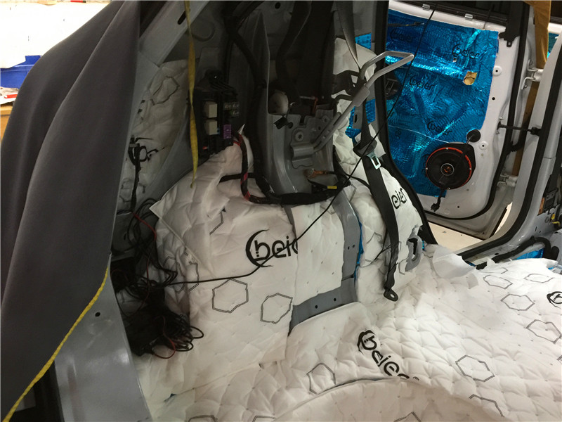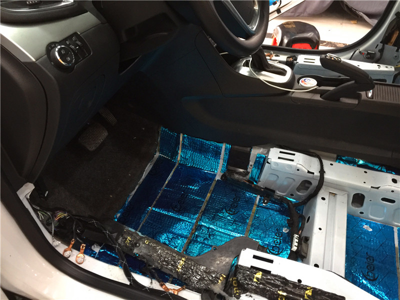 首先用減震板進(jìn)行止震處理,提高底盤的剛性,減少共振產(chǎn)生噪音;再貼一層吸音棉,除了吸音效果外,提高了底盤的密閉性,隔音效果自然更加好。