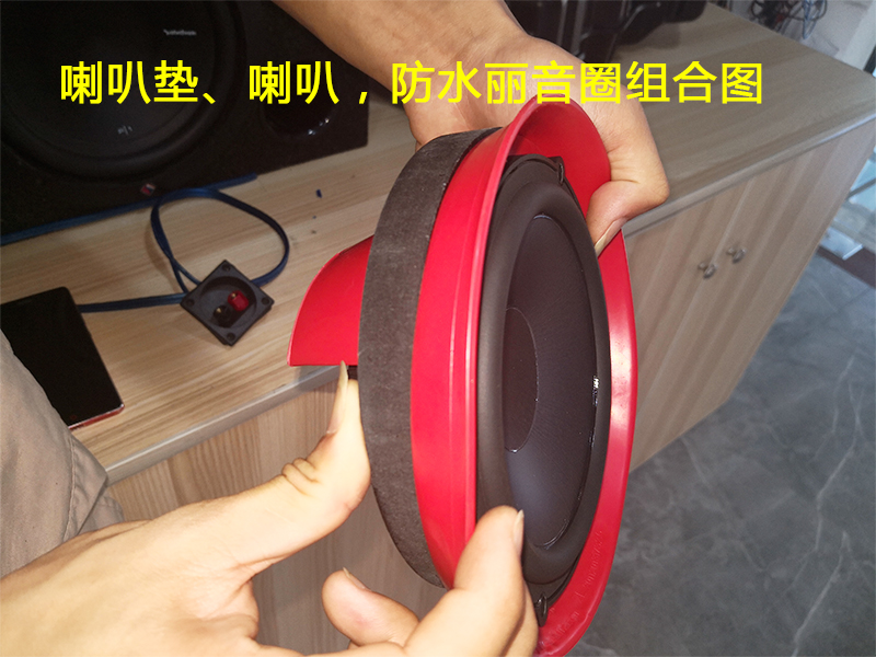 喇叭附近紅色的防水罩為廣州德樂汽車音響改裝店的專利產(chǎn)品,處理有防水作用而且可以提高音質(zhì)效果的30%的麗音功能