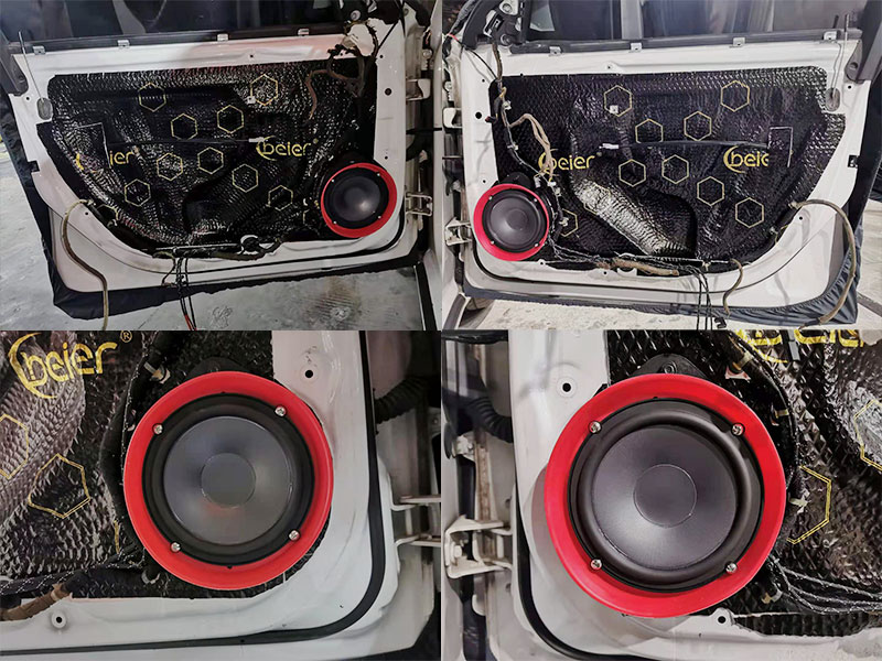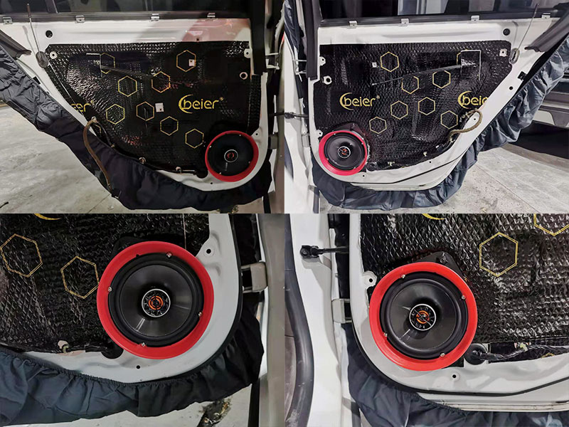 第二步是安裝喇叭和做第二層隔音。喇叭的安裝使用的是專車專用的喇叭墊,直接在原車的基礎(chǔ)上進(jìn)行更換,不用倒模或者打孔之類的。無(wú)損安裝就是這么省心。