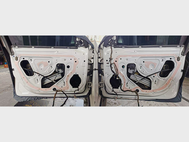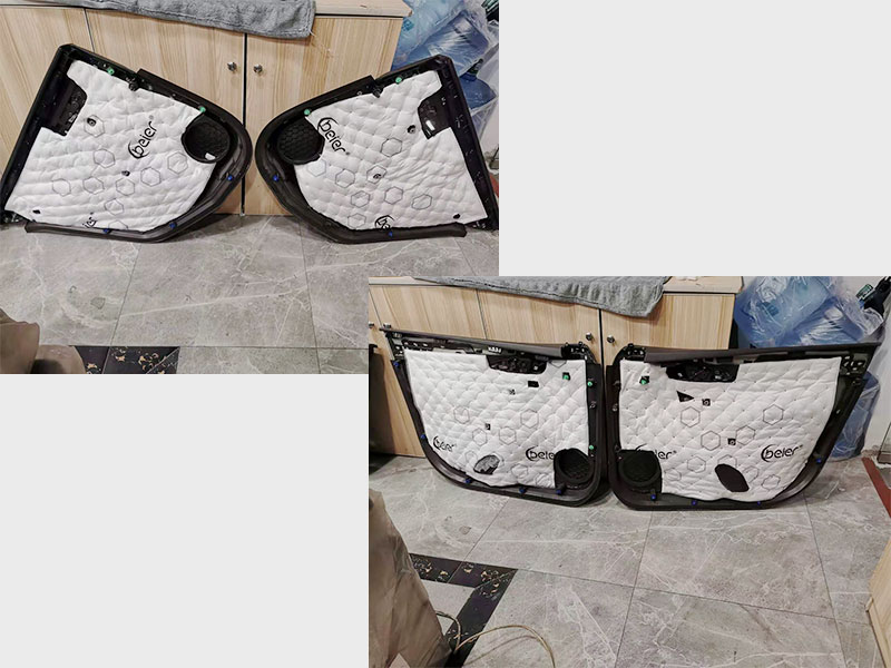 升級(jí)音響的第一步永遠(yuǎn)都是先做四門隔音。對(duì)原車進(jìn)行保護(hù)后,我們進(jìn)行了插接拆解門板,完成第一層隔音。使用到的是貝爾的黑膜。