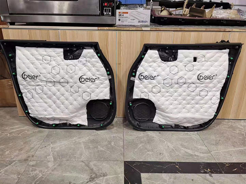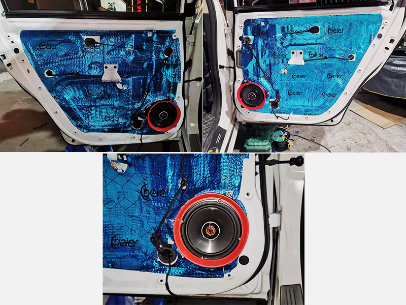 我們都知道,原車(chē)的門(mén)板厚度是比較薄的,行駛過(guò)程中容易產(chǎn)生共振,風(fēng)噪也是挺大的,這樣的環(huán)境您覺(jué)得聽(tīng)音樂(lè)音質(zhì)還會(huì)好嗎。所以我們首先要把四門(mén)隔音給做好,這里門(mén)板是做了兩層隔音的,第一層實(shí)在門(mén)板的內(nèi)部(師傅忘拍照了),第二層是在外圍,這樣就可以形成箱體,減少車(chē)門(mén)的共振和降低風(fēng)噪的同時(shí),也能有一個(gè)相對(duì)較好的車(chē)內(nèi)環(huán)境。