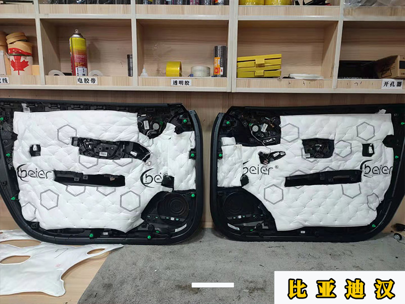第二層隔音和喇叭的安裝,門板的第二層隔音可以密封,讓門板變成一個(gè)簡(jiǎn)易的箱體。很大一部風(fēng)車型原車的門板隔音是幾乎沒(méi)有隔音效果的。然后喇叭安裝這里,需要更換比亞迪漢的專用喇叭墊,這樣才可以無(wú)損的把喇叭裝上去,外面套上去的是一個(gè)防水罩。