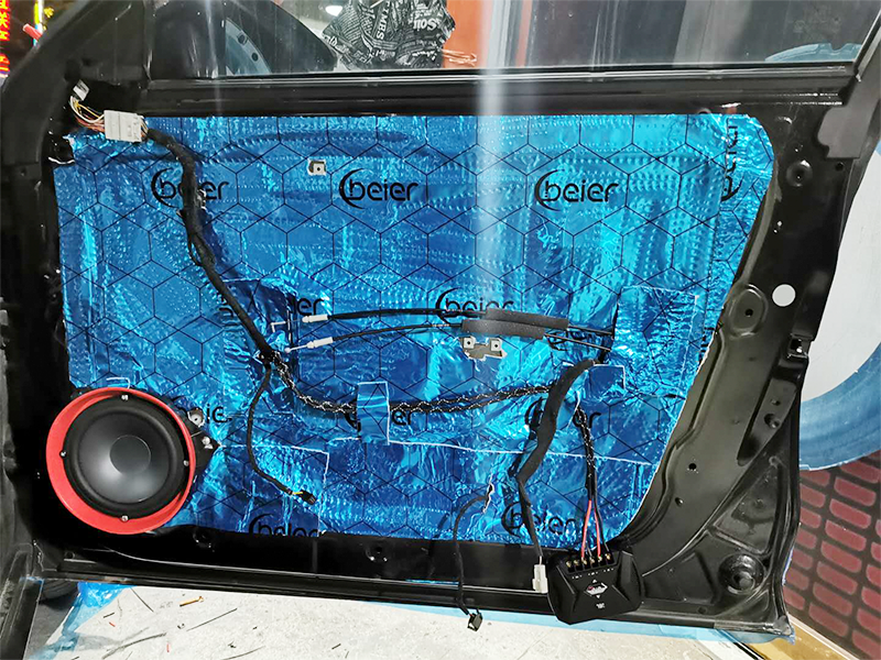原車鈑金厚度單薄,非常容易產(chǎn)生異響噪音,所以必須使用貝爾藍(lán)膜隔音加強(qiáng)鈑金厚度