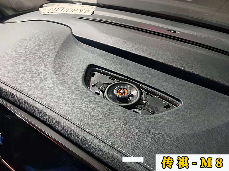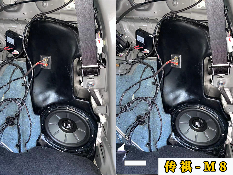 首先是前后的喇叭全部升級為JBL的600C,儀表臺(tái)的中置也更換了,后尾箱裝了一個(gè)定制箱體的10寸低音炮,前后聲場的喇叭用兩臺(tái)圣美歌的功放來推,處理器裝的是阿爾派的R600.然后四門隔音是貝爾的黑金剛黑膜。