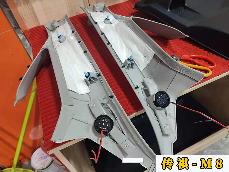A柱上兩個(gè)高音也是直接更換就可以了。直接卡上去固定好,后門的高音是在拆下來的蓋板上的。然后后門的高音是在拆下來的門板上的,也是直接固定好就可以了。