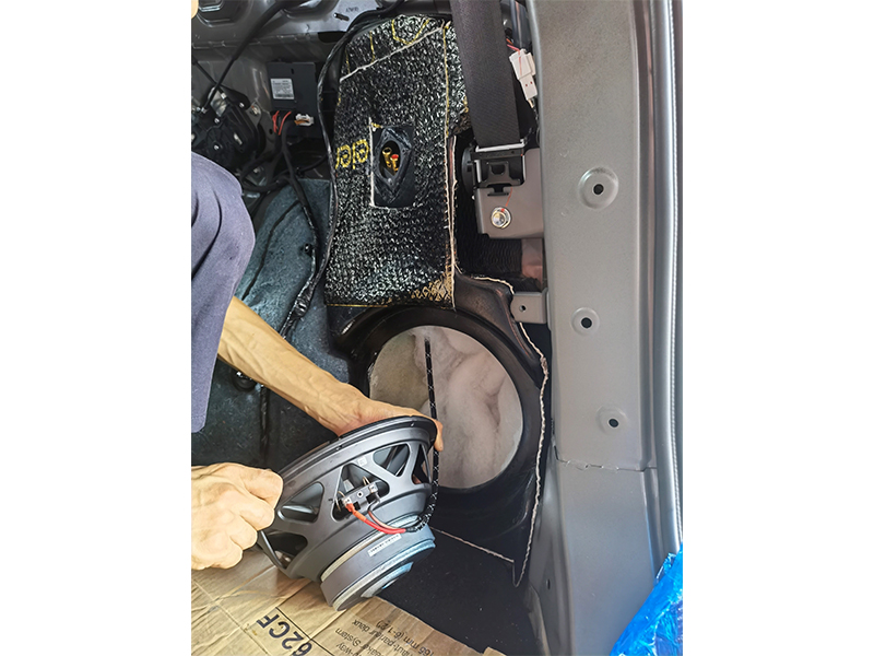 M8原車低音位置在尾廂右側(cè),在安裝低音之前要對(duì)這個(gè)部位做隔音加強(qiáng),防止共震出現(xiàn)