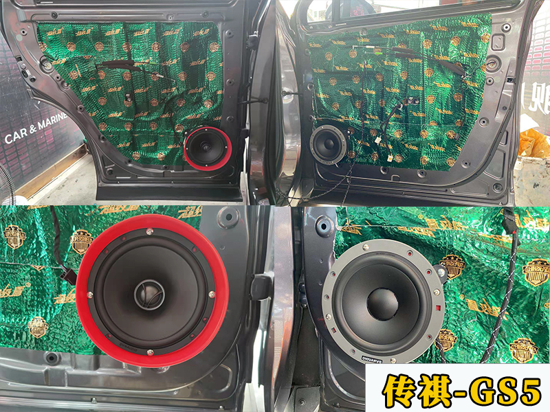 這次第二層隔音,可以密封整個(gè)車門。貼好之后就可以安裝喇叭了,這里需要更換一個(gè)喇叭墊,GS5的專用墊,這樣就可以將喇叭直接安裝上去了。打孔都不用,全程無(wú)損,高音喇叭也有直接在原來(lái)的位置安裝的。
