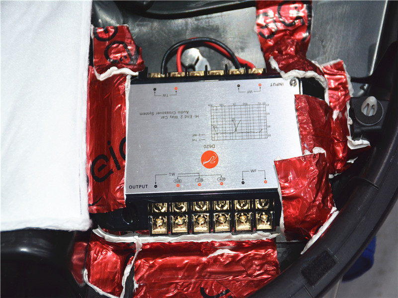 原車?yán)仁乔啊⒑笏拈T6個(gè)喇叭、改裝后8個(gè)喇叭4個(gè)高音4個(gè)中低音喇叭。前聲場是惠威D620二分頻套裝4歐阻抗60W功率,后聲場惠威NT600二分頻套裝4歐阻抗50W。功放是由惠威X3 4路A/B 類功放每路4歐100W功率,推動(dòng)要想得到好的整體聲場和音樂曲線頻響體現(xiàn)必須加個(gè)帶具有《電子分頻》《延時(shí)》《EQ調(diào)節(jié)》功能,我們是選擇一款無損改裝專用DSP,體積小、自帶50W每路功放DSP處理器作為前級(jí)處理,改裝后聽一首張學(xué)友專輯《等你等到心痛》可以得到強(qiáng)勁有力中低頻和人聲清晰干凈而不渾濁高音。