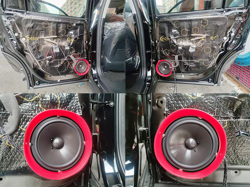 上面兩張圖是第二層隔音貼完之后的效果,還有就是喇叭的安裝效果圖,第二層隔音就不多說了,主要是在喇叭的安裝上,我們使用的都是專車專用的喇叭墊,是完全復(fù)合原車安裝位的。紅色的外層是喇叭防水罩。是用來防止雨天雨水滲進(jìn)門板里面對喇叭造成損壞。