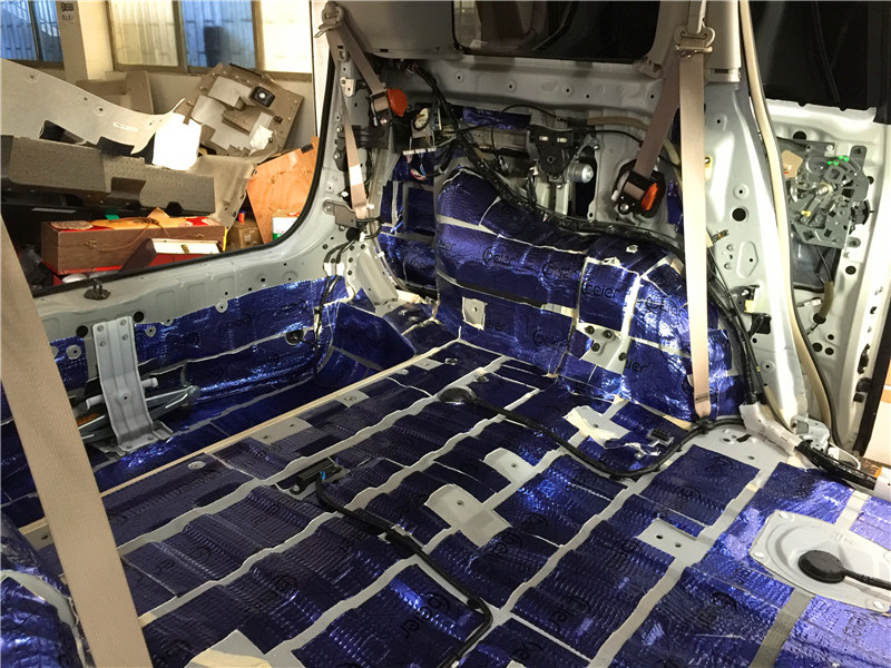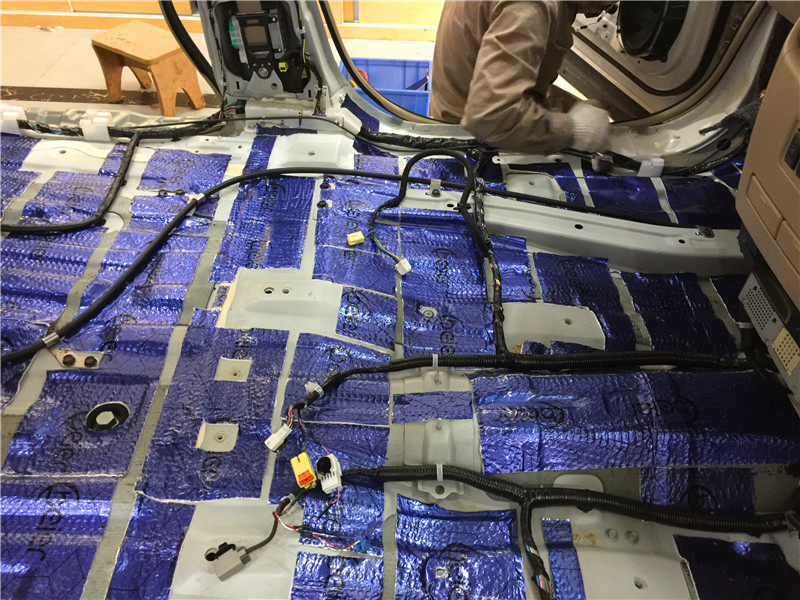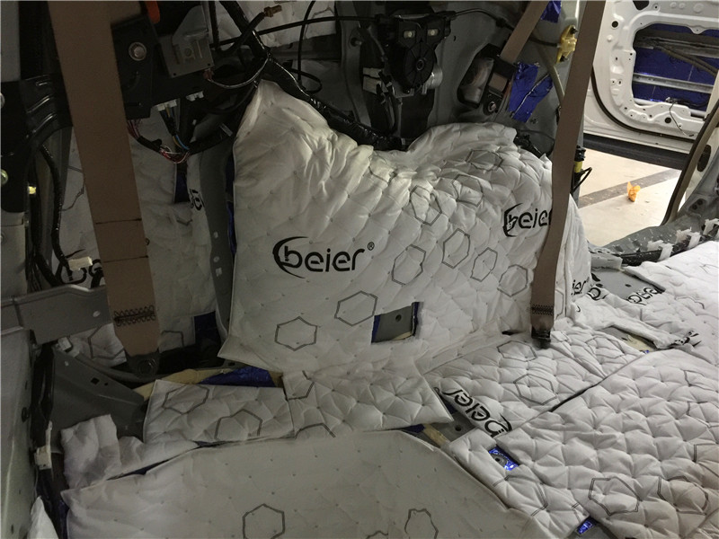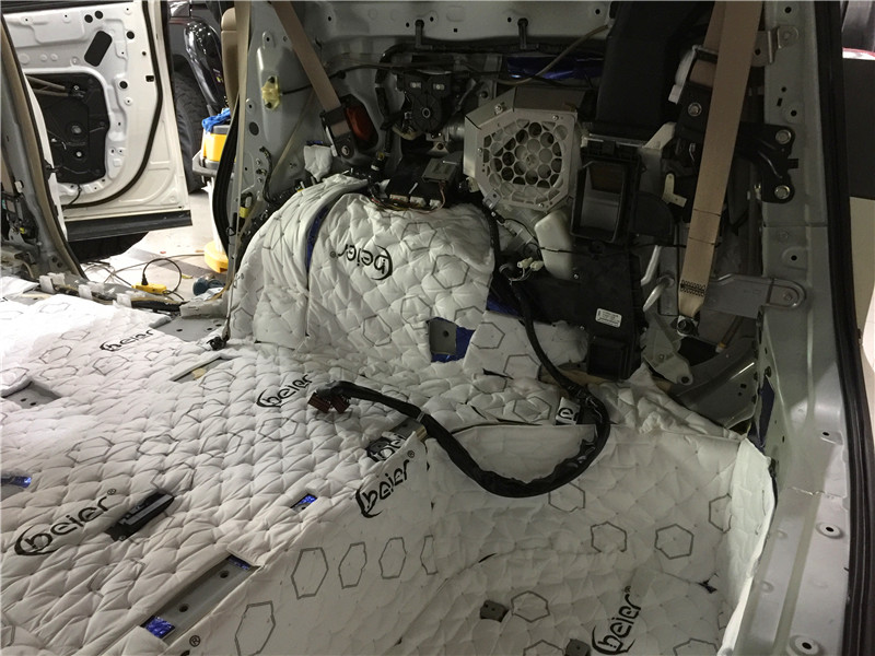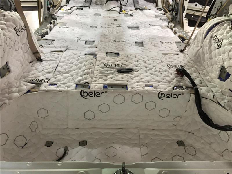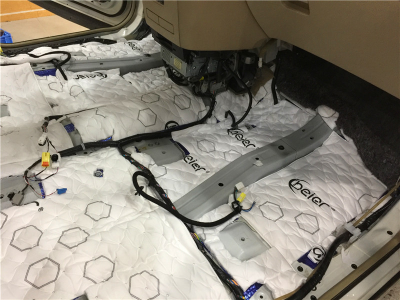 第一層止振做完開始鋪貝爾溫莎,貝爾溫莎具有優(yōu)異的吸音和隔熱特效,能有效衰減汽車內(nèi)部高頻噪音,提升駕駛舒適度,阻隔熱量的傳導,節(jié)約空調能耗;貝爾溫莎材料比重低,在車內(nèi)使用增重少,不會增加油耗。