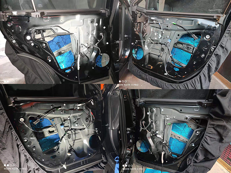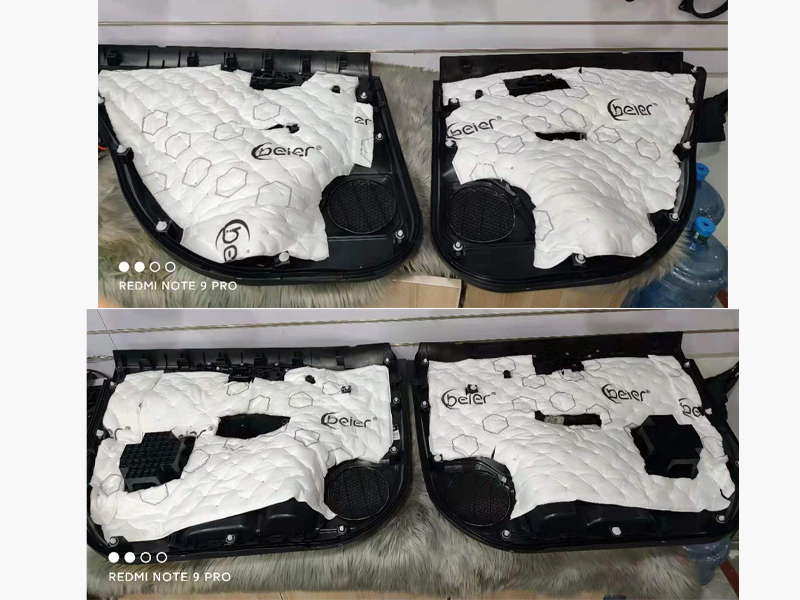 車門的異響很大一部分來(lái)自門板臺(tái)薄和內(nèi)部零件松動(dòng),這里我們還要再貼上一層吸音棉,厚實(shí)的吸音棉能起到填充和降噪的作用。這很大程度上能減少異響。