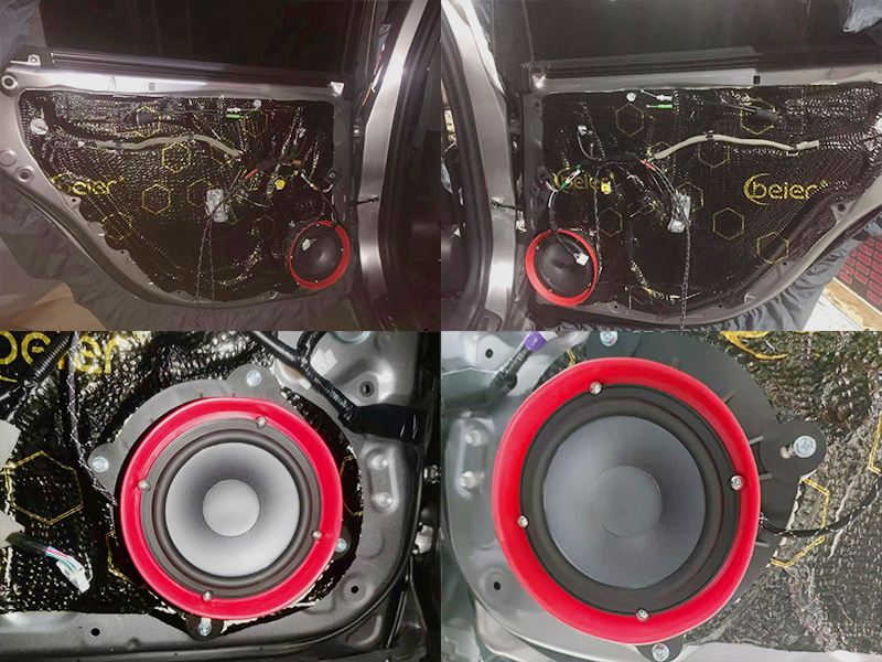 第二層隔音貼好之后我們就可以安裝喇叭了。但要說明一下的是,我們的安裝升級都是建立在更換的基礎(chǔ)上的,就是我們有專車專用的喇叭墊和喇叭防水罩。是不存在鉆孔之類會損失您愛車的操作。紅色的喇叭罩能防水,防止一些磕磕碰碰之類的。