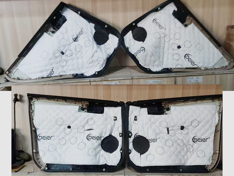 由于車主沒有選裝DSP和低音炮!這里我們只需要給層門做第三層的隔音層就可以了。使用的是吸音棉。主要作用是降噪,這也是針對車主說的有很多的噪音,做出的相應調整。其實如果是一般的升級,這些都是基本的操作。基本都是需要做的。