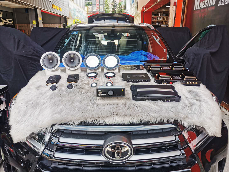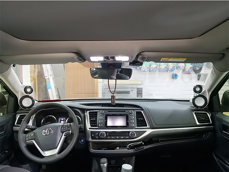 豐田漢蘭達升級全套德國原裝進口曼斯特頂配白盆三分頻喇叭,車主專車從茂名開車到廣州總店升級10元音響喇叭,原車6個紙皮喇叭的搖身一變升級為全套10個頂級人聲喇叭+一個JBL頂級低音炮