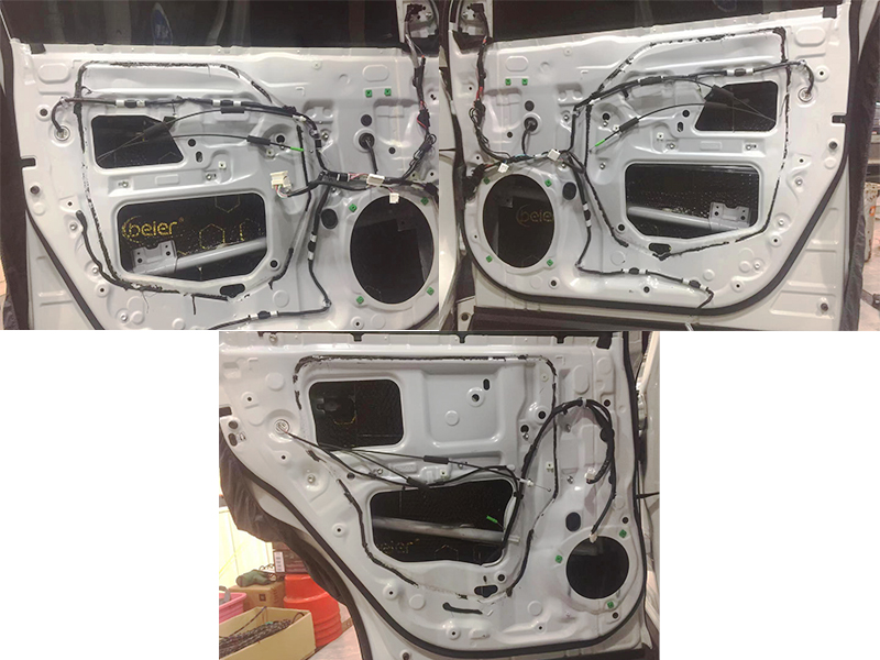這輛漢蘭達(dá)一共升級(jí)了原車的而六個(gè)喇叭,分別是四個(gè)車門的中低音,這里后門的中低音換成了同軸喇叭,還有兩個(gè)中控臺(tái)左右兩邊的高音單元。這里我們先貼四門的隔音,使用的是更厚,效果更佳阿貝爾隔音黑膜,