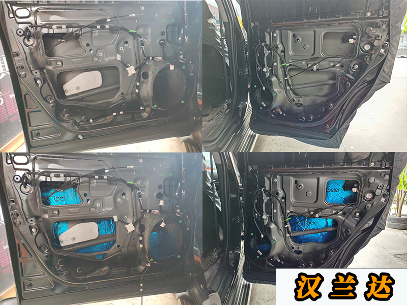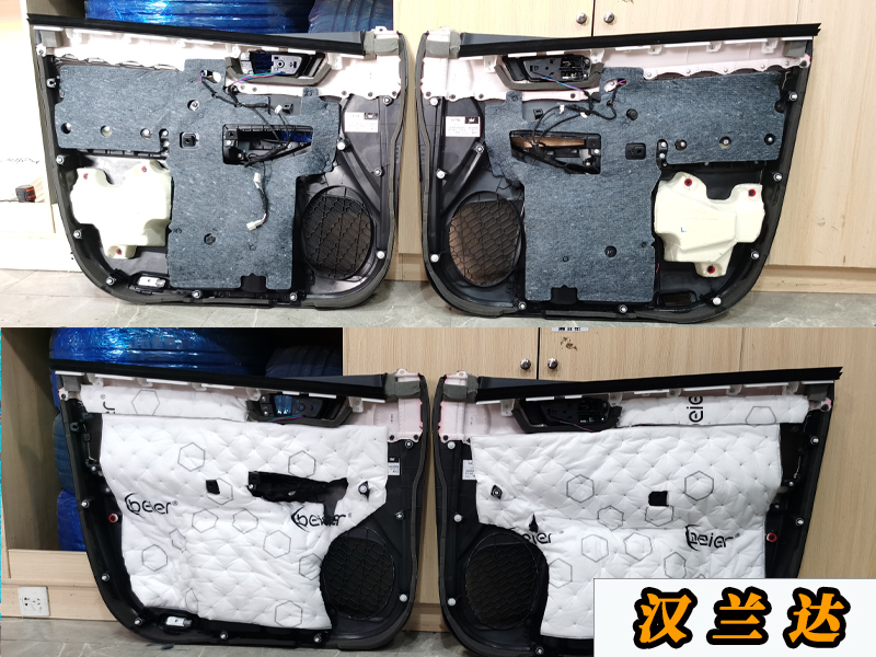 首先要做的是就是門板的隔音和喇叭安裝,門板是三層的隔音,材料是兩層止震板和一層吸音棉,第一層止震板是貼在內(nèi)壁的,可以有效解決鐵皮過薄的原因。然后就是第二層則是可以給整個門板做密封,密封環(huán)境音質(zhì)也會好一些,就是音箱的原理。第三層是貼在門皮上的一層吸音棉,主要是用來吸音降噪的。