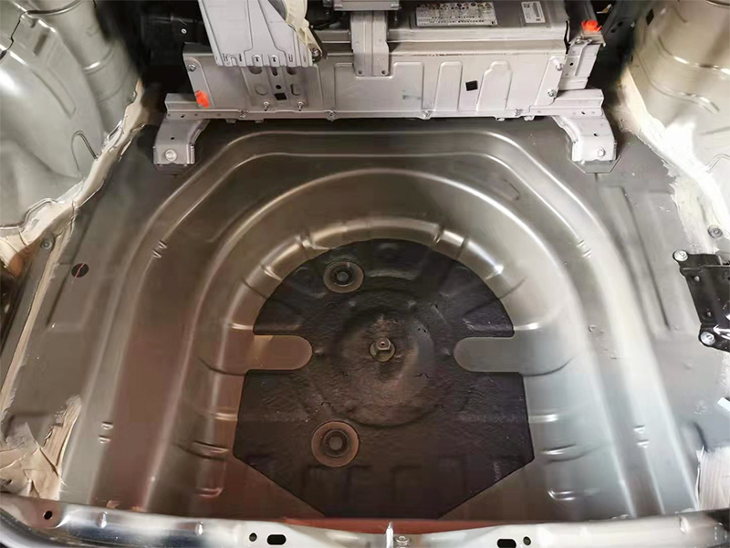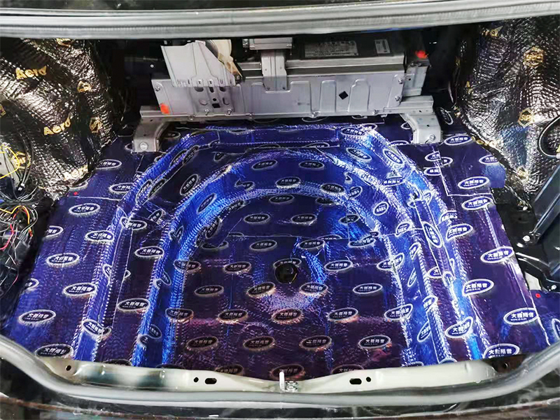 同理清理雜物之后進(jìn)行第一層隔音,使用全車大能藍(lán)金加強(qiáng)鈑金厚度減少共振