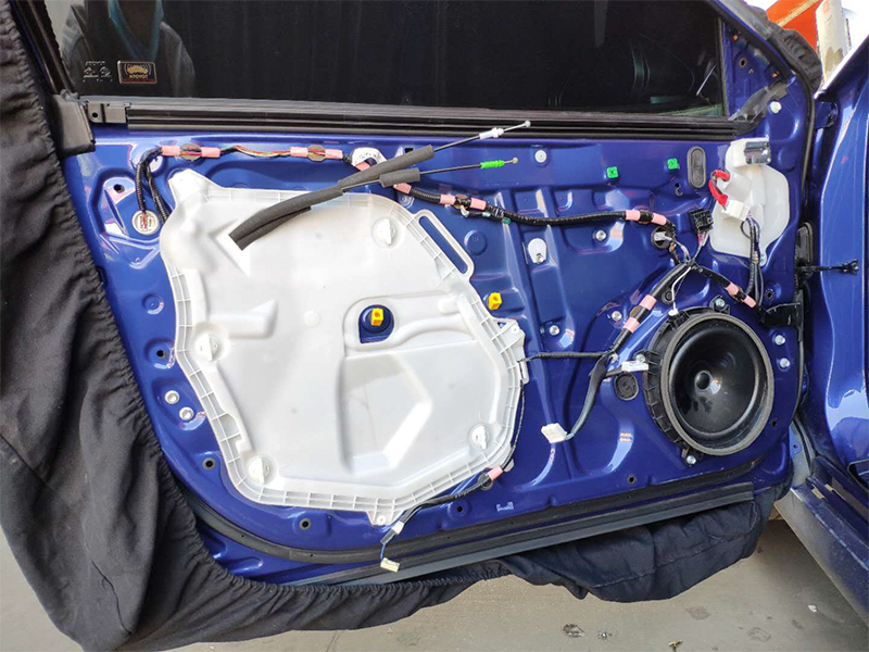 把白色的防水板拆下來(lái),對(duì)里層的鈑金進(jìn)行強(qiáng)化厚度,減少共振