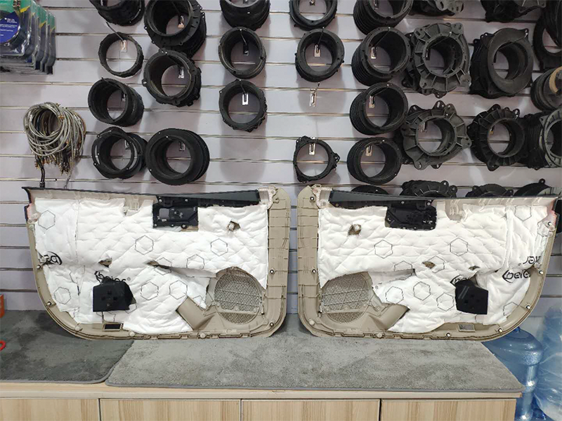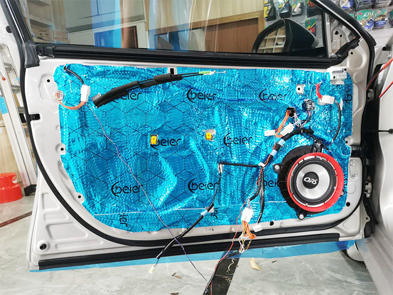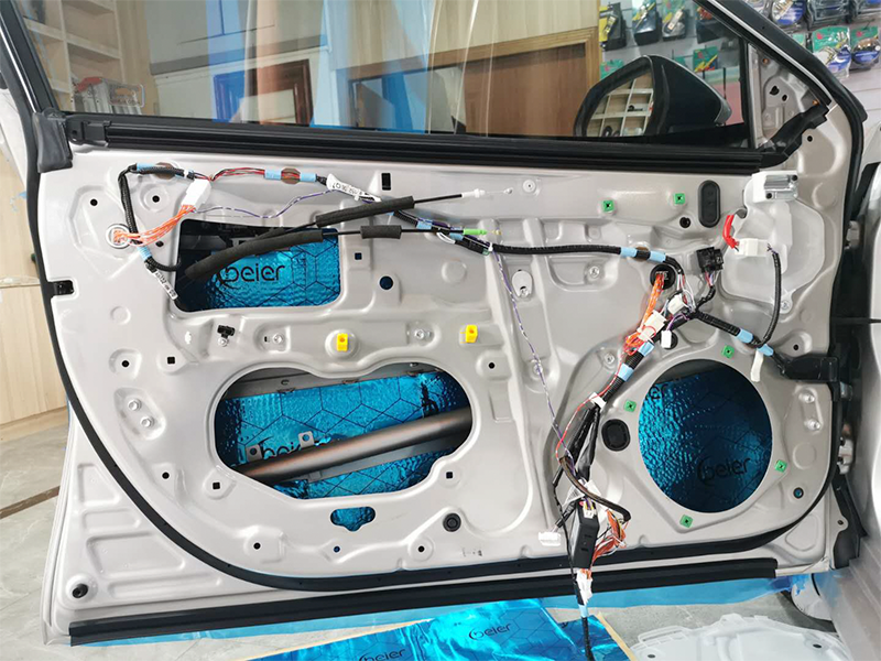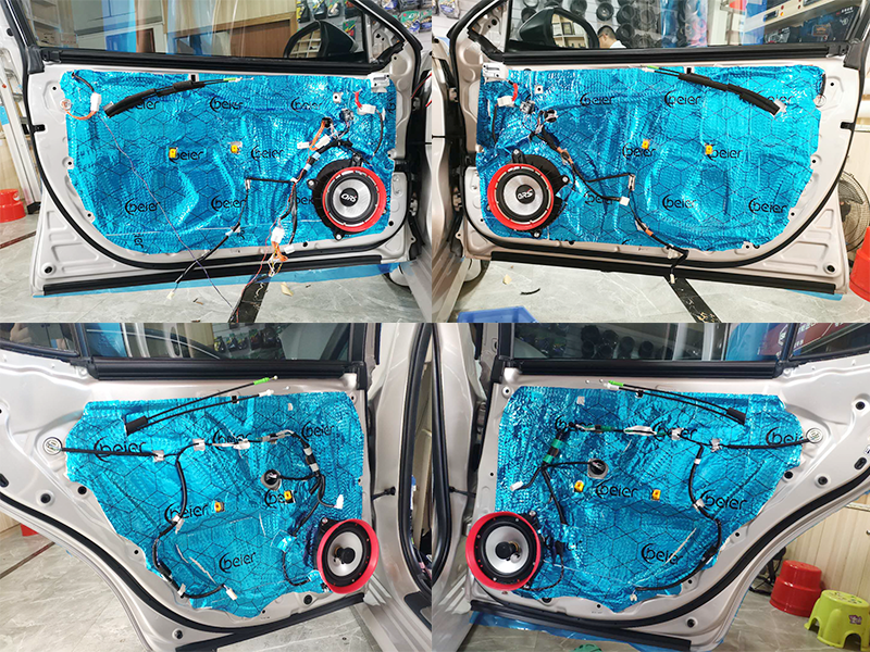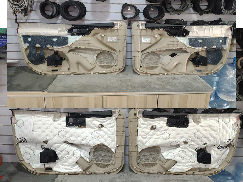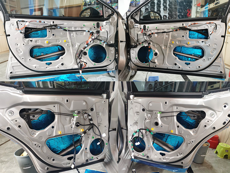 原車門板的鈑金非常的單薄,容易產(chǎn)生共振,第一步就是提升箱體厚實度使用貝爾止震板隔音