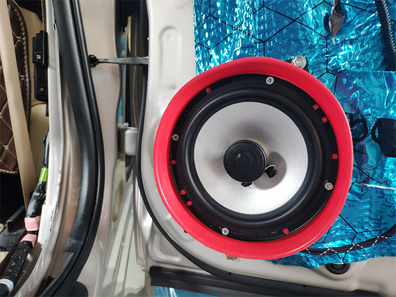 喇叭在原車門板上的標準安裝圖,由專用喇叭墊和防水罩組合而成