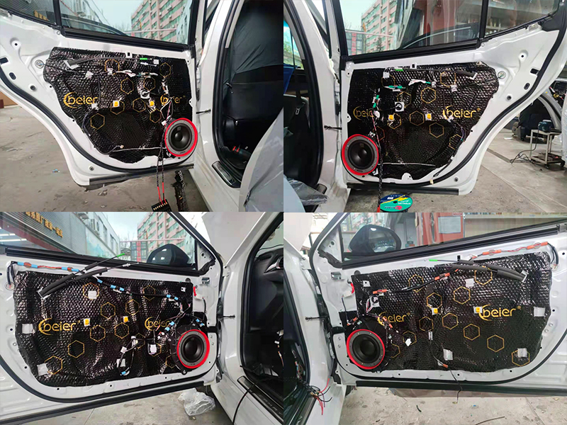 隔音帖的是貝爾稍微好一點(diǎn)的黑膜,喇叭的安裝我們都是使用專車專用的喇叭墊和喇叭大防水罩(喇叭外紅色那圈)。在此之前在車門的內(nèi)壁還貼了一層隔音的哦,這樣下來車門就形成了一個箱體。整車內(nèi)部的內(nèi)循環(huán)也會變得更好。
