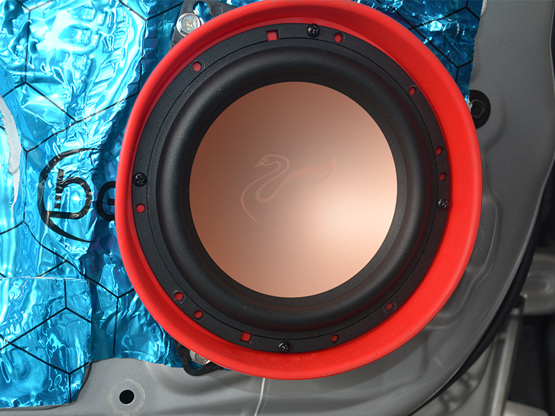 車門外層減震與喇叭安裝,隔音做得整齊有序,處處能體現(xiàn)出德樂汽車音響師傅的工藝水平